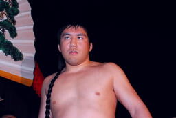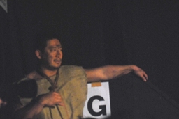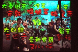 始皇帝と劉禅の局面。何も解説はなかったが、劉禅とは劉備玄徳の息子で蜀帝を継いだものの、全く凡庸で魏に自分の身を守ることを条件に降伏した三国志登場人物中最大級のアホキャラ。それでバカボンメイクか。始皇帝が劉禅の腕をひねる(右写真)、劉禅は切り返そうとするが切り返せない。