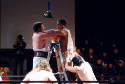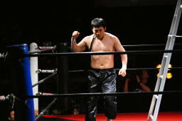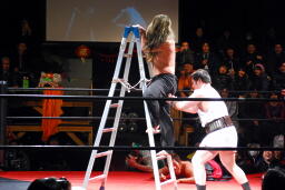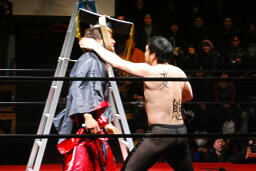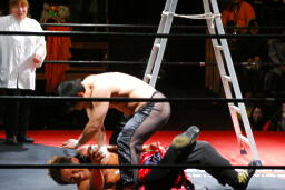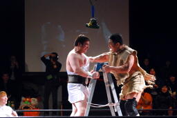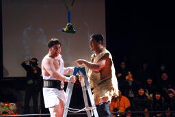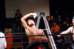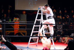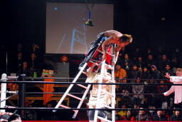始皇帝がラダーに上る、安敦がカンチョー(左写真)、場外に出す。