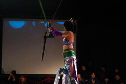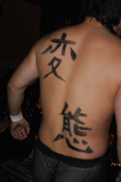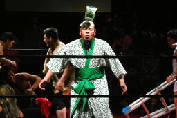 スクランブルバンクハウス形式なので各選手は客席に散らばってカウントダウンを聞く。偏腿王の背中には「変態」の文字。(右写真)