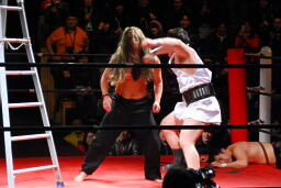 リングに戻って来た始皇帝がラダーごとスピアー(左写真)。