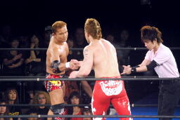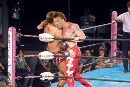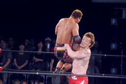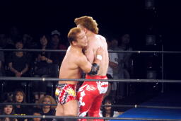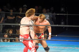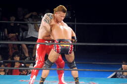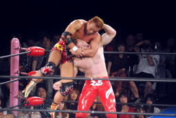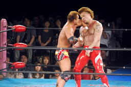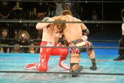 再度ロックアップ、田中ヘッドロック、ゼウスロープに振ってショルダーブロックの打ち合い(右写真)。