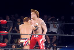 チョップの打ち合い(左写真)。ゼウスの胸が赤黒く内出血。