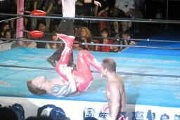 田中切り返してハンマーロックからヘッドロック、フライングメイヤー(左写真)、ゼウスはヘッドシザーズで返す。