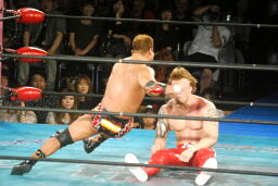 ロープに詰まった田中をラリアットで場外に落とす(左写真)。