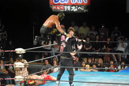 ビリーがタイガースにコウモリ吊り落とし式ショルダーバスター(右写真)。