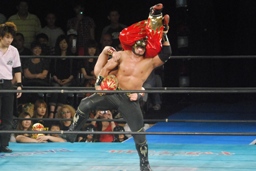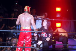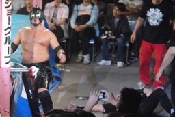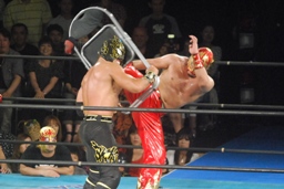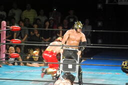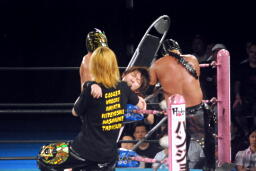タイガースロープに飛ぶ、空牙がリングサイドからイス攻撃(右写真)。