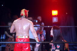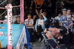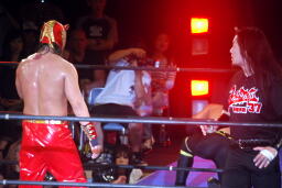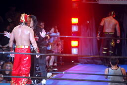HAYATAが吉野レフェリーを捕まえる(左写真)。
