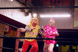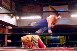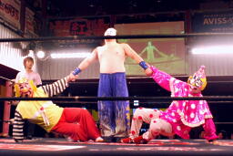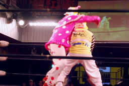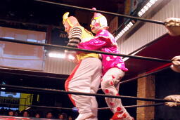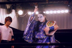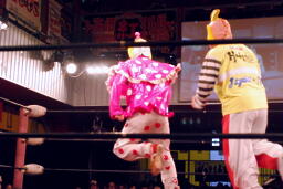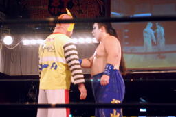 この試合、当初の発表ではビリーケン・キッドが入ってタッグマッチの予定だったがビリーが急遽欠場、お笑い三巨頭による3wayに変更となった。松山勘十郎入場(右写真)。