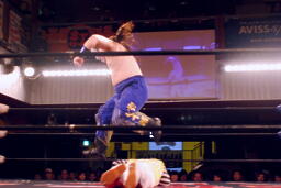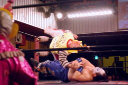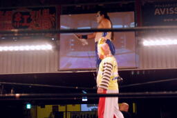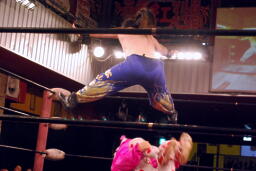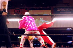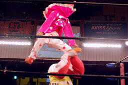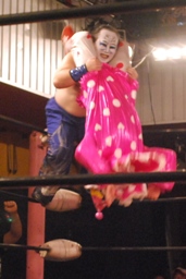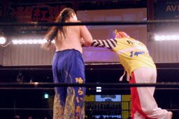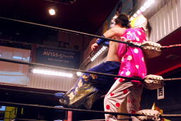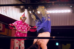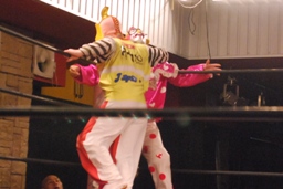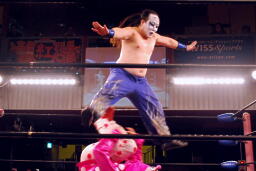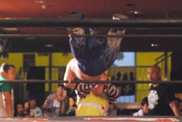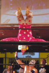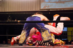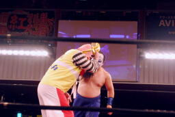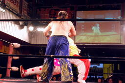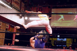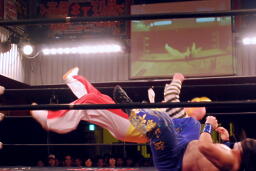 勘十郎をリングに戻して雪崩式フランケンシュタイナー(右写真)、カウント2。