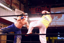 ハリセン乱打、えべっさんはキックで応戦(右写真)。えべっさんハリセンを奪い取るが自分は使わない。