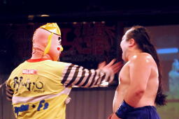 えべっさんとくいしんぼうが逆さ押さえ込みの掛け合い(右写真)、