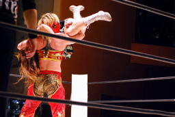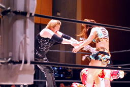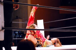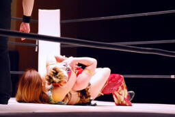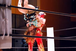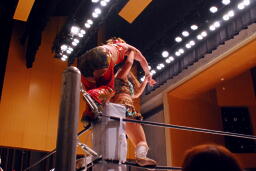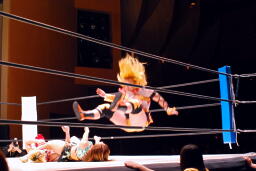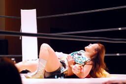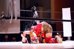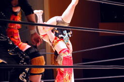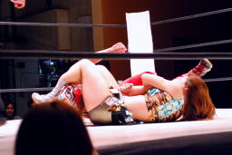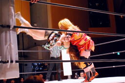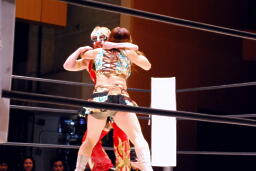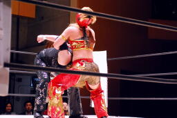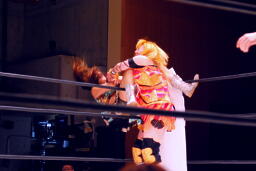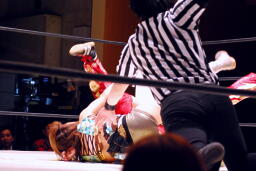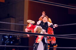藪下コーナーに上る、春山雪崩式ブレーンバスター(右写真)、カウント2。春山はLeonにタッチ。10分経過。