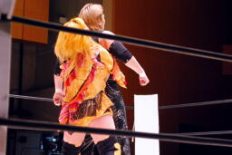 藪下コーナーに振る、Leon切り返して串刺しドロップキックからダブルアームスープレックス(左写真)、カウント2。Leonストンピング、ロープに飛ぶ、堀田がエプロンからチェーンで一撃。