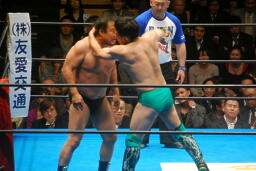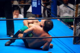 石川が返すとケサ固めからネックロックに(右写真)、石川ロープ。