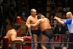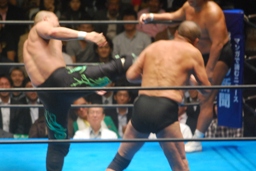 長州ガットショット、首投げからスリーパー(左写真)、リリースしてストンピング、長井にタッチ。