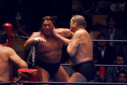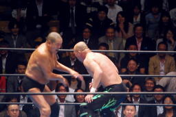 藤原張り手(右写真)、長井パンチ、藤原キャッチしてワキ固め、長州がカット。