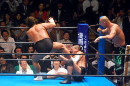 長井キック(右写真)、首投げからスリーパー、藤原ロープ。ギロチンドロップ、藤原急所攻撃。長井は長州にタッチ。藤原も藤波にタッチ。