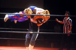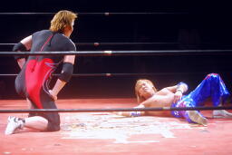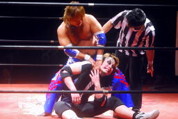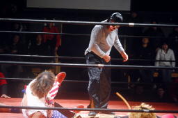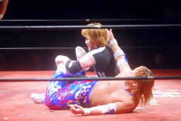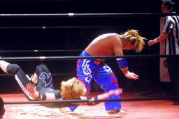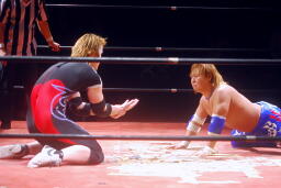 しかし観客の反応が鈍い。リングアナ「モントリオール事件が伝わらなかったようなので、レフェリーをジャッジ金子に変えて試合をやり直します。」やり直し!