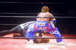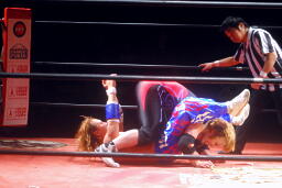 エビ固めに(右写真)、カウント2。
