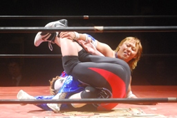 佐野ヘッドシザーズからエビ固めに丸め込む(左写真)、カウント2。