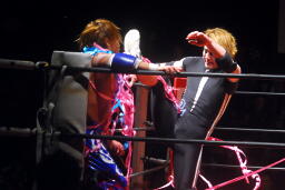 佐野切り返す。お約束にことごとく挑戦するプロレスだ(左写真)。