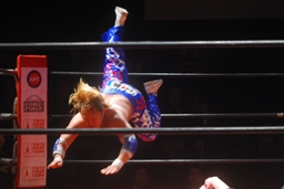 スワンダイブ狙ってトップロープに飛び乗るが失敗(左写真)