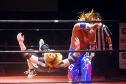 両者ロープに飛んでラリアット相打ち(右写真)。