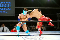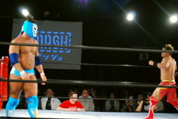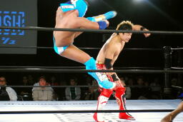 再度ロックアップ、KUSHIDAがハンマーロックからヘッドロック、Mentalloロープに振る、KUSHIDAショルダーブロック。KUSHIDAロープに飛ぶ、Mentalloはリープフロッグで前後から来るKUSHIDAを2度かわす(右写真)。