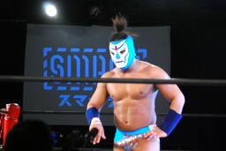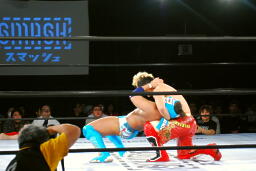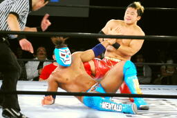 顔面にドロップキック(右写真)、カウント2。Mentallo肩に担ぐ、KUSHIDA着地してロープに飛ぶ、Mentalloカウンターのソバット。