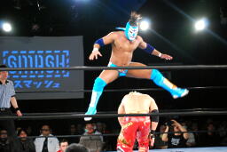 MentalloはKUSHIDAをハンドスプリングで飛び越えるとコーナーに飛び乗って反転クロスボディ(右写真)