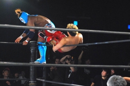 Mentalloケブラーダ狙ってコーナーに上る、KUSHIDAエプロンに戻ってドロップキック(右写真)、Mentallo場外転落。