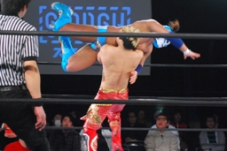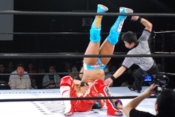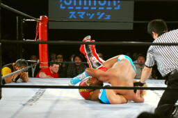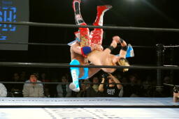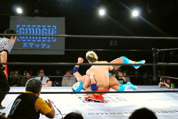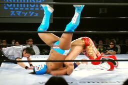 Mentalloノーザンライトスープレックス、倒立して固める(左写真)、カウント2。