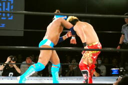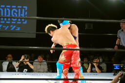 KUSHIDAガットショット、ロープに飛ぶ、Mentalloガットショット、KUSHIDA足をすくって逆エビ、Mentalloブロック。KUSHIDAはトラースキック(右写真)、カウント2。10分経過。
