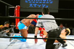 MentalloはKUSHIDAの腕を取るとロープでバウンドして(右写真)ホイップ。