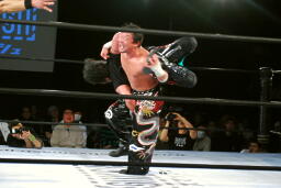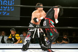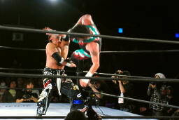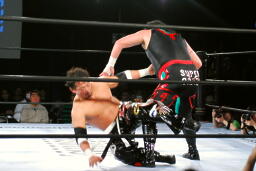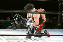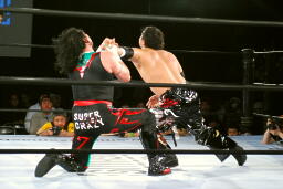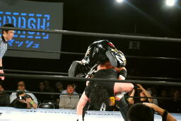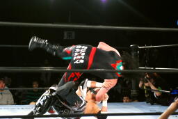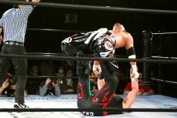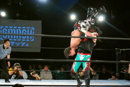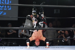 クレイジーロープに振る、TAJIRI切り返してメキシカンバックブリーカー(左写真)、ぶん回して落とす。両者ダウン。