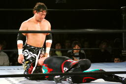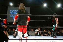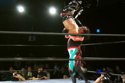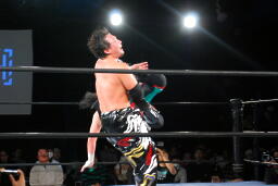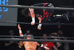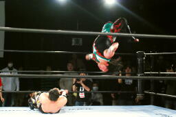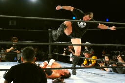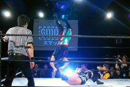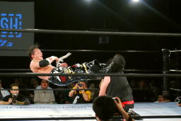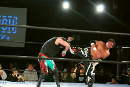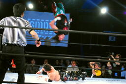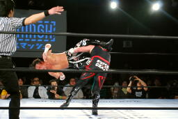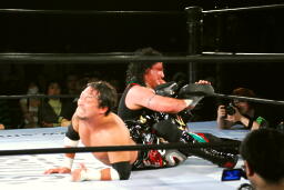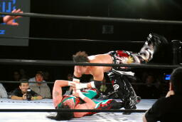 TAJIRIドロップキック(左写真)、カウント2。