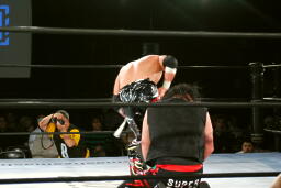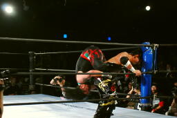 TAJIRIコーナーに追い込んで背中にキック、逆水平、対角線コーナーに振る、クレイジー切り返すがTAJIRIは突進をかわしてタランチュラに(左写真)。