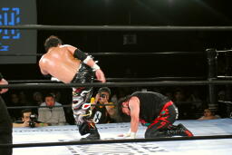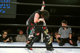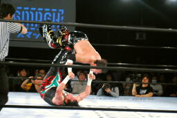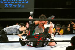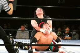 TAJIRI前方回転エビ固め(右写真)、カウント2。