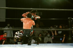 TAJIRIトラースキック(右写真)、カウント2。