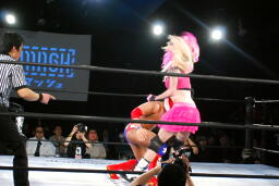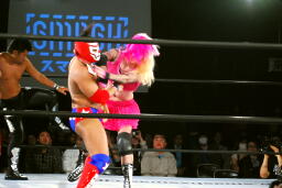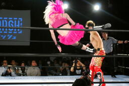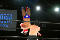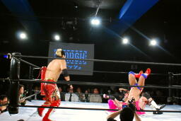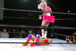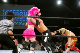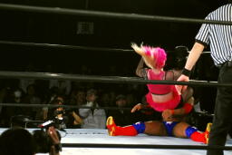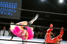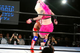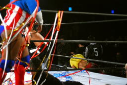 KUSHIDAが肩車にジェシカを捕えMentalloがコーナーに上るが大原が阻止(左写真)。