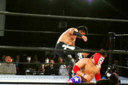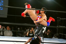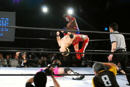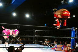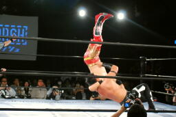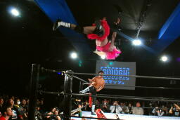 大原のラリアットをかわすとロープに飛び乗ってムーンサルトアタック(左写真)、カウント2。