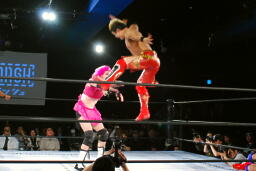 Mentalloロープに飛ぶ、大原カウンターのフォアアームスマッシュ(右写真)、ジェシカにタッチ。