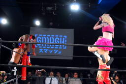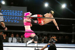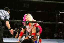 ジェシカがロープに飛ぶ、Mentalloキャッチしてマンハッタンドロップ(右写真)、KUSHIDAにタッチ。