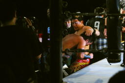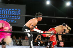 大原が入りKUSHIDAとエルボーの打ち合い(左写真)、そのまま場外に。