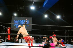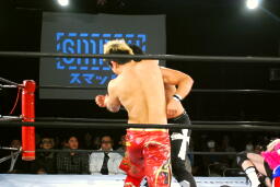 KUSHIDA大原にソバット(左写真)、大原前屈みに。