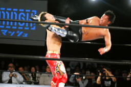 KUSHIDAトップロープに飛び乗る(左写真)、