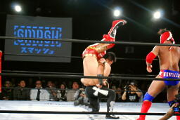 KUSHIDAのその場跳びムーンサルトとMentalloのダイビングギロチンドロップが同時に(右写真)、2人で押さえるがカウントは2。
