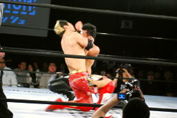 KUSHIDAは昼のシングルに続き連敗、と書くとKUSHIDAスランプか?みたいな話にすぐなるけど、そんなもん勝ったり負けたり(特に大原とKUSHIDA)なんだし、それで無理矢理この2人に優劣を付けてドラマ化するってのもなあ・・・。