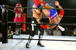Mentalloロープに飛ぶがジェシカカウンターのキック(左写真)。