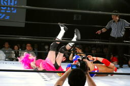ロープに振ってドロップキック(左写真)、カバーは大原がカット。5分経過。